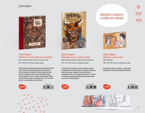 260 × 260 mm, 32 stran, brožovaná vazba 203 × 203 mm, 32 stran, pevná vazba 203 × 203 mm, 32 stran, pevná vazba Příběh na motivy filmové pohádky Pekelné masky a zpěvy (řevy) Pekelné omalovánky